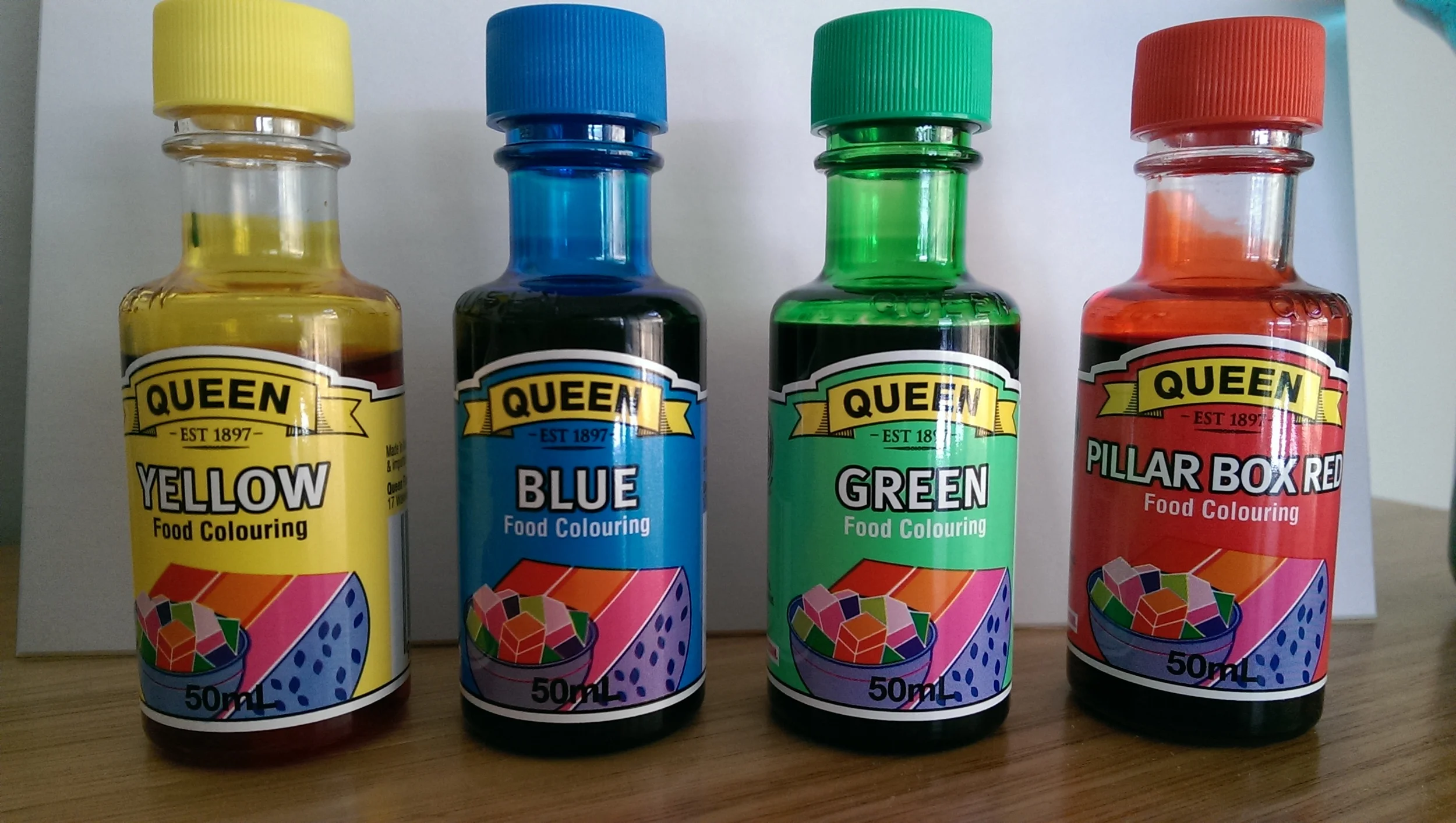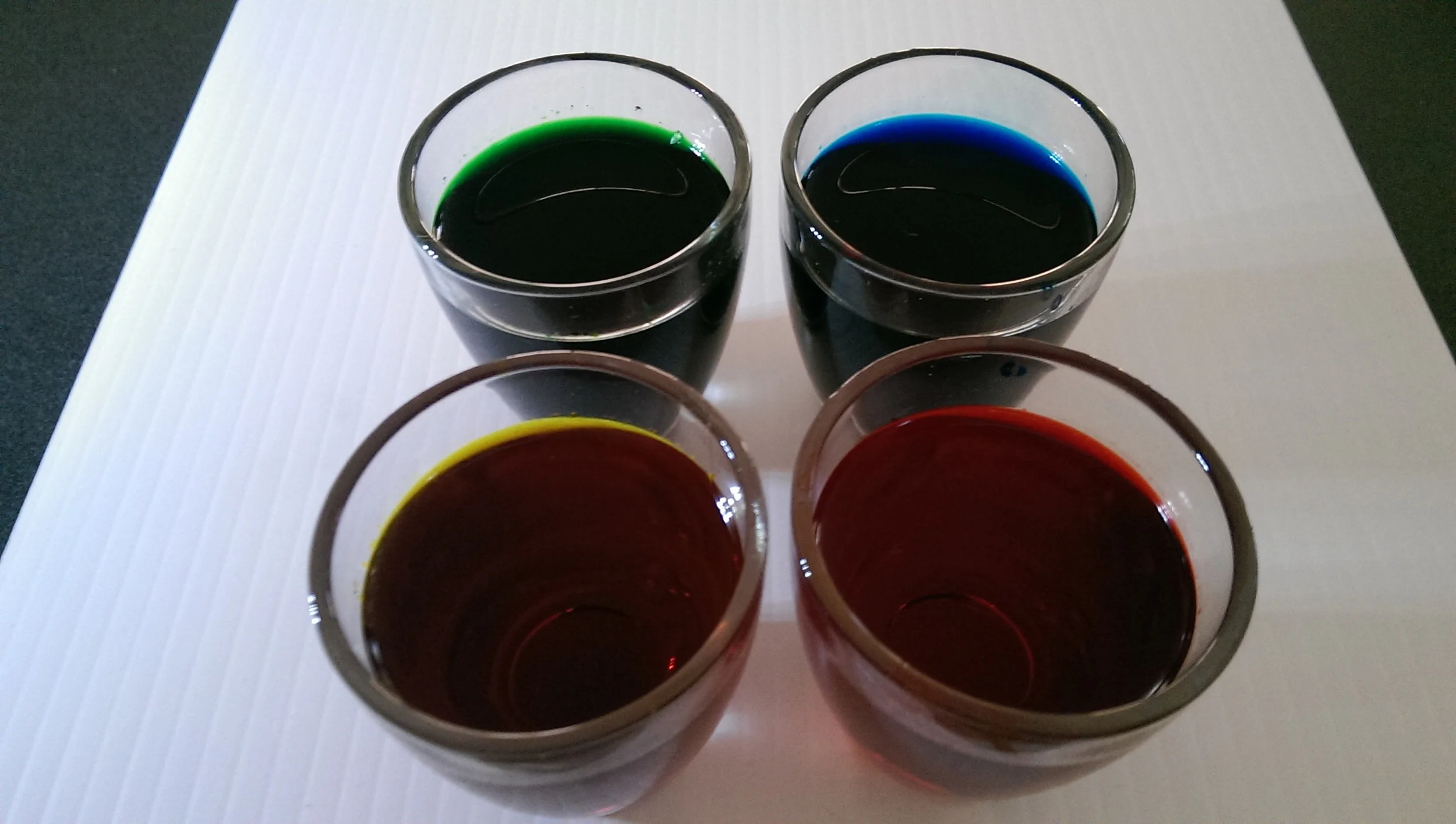 4) Mix a little bit of food dye with water, 1 colour per glass, in this case I'm using shot glasses. You could even mix dyes to get the colours you are after.